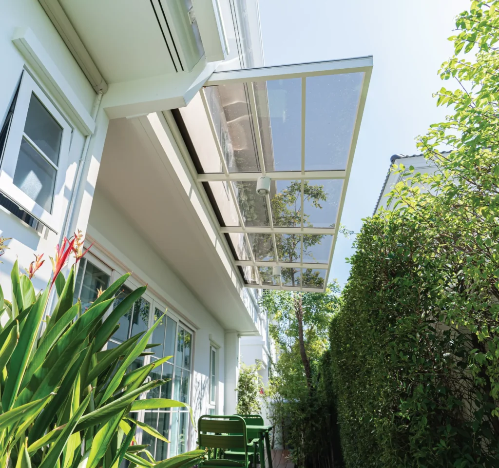 ผลิตจากอะลูมิเนียมเกรดพรีเมียม มั่นใจได้ในความแข็งแรง ทนทาน แต่น้ำหนักเบา ไม่เป็นภาระต่อโครงสร้างบ้าน ติดตั้งแบบซ่อนสกรู ทําให้กันสาดดูเรียบเนียน สวยงาม ไร้รอยต่อ ไร้กังวลเรื่องน้ำรั่วซึม มอบทั้งความสวยงาม ความ ทนทาน และความสบายใจ เพื่อการใช้ชีวิตได้อย่างไร้กังวล